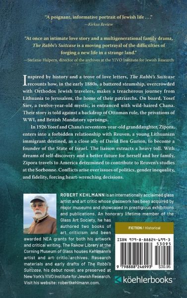 Inspired by history and a trove of love letters, The Rabbi's Suitcase recounts how, in the early 1880s, a battered steamship, overcrowded with Orthodox Jewish travelers, makes a treacherous journey from Lithuania to Jerusalem, the home of their patriarchs. On board, Yosef Siev, a twelve-year-old mystic, is entranced with wild-haired Chana. Their story is told against a backdrop of Ottoman rule, the privations of WWI, and British Mandatory uprisings. In 1926 Yosef and Chana's seventeen-year-old granddaughter, Zipora, enters into a forbidden relationship with Reuven, a young Lithuanian immigrant destined, as a close ally of David Ben Gurion, to become a founder of the State of Israel. The liaison extracts a heavy toll. With dreams of self-discovery and a better future for herself and her family, Zipora travels to America determined to contribute to Reuven's studies at the Sorbonne. Conflicts arise over issues of politics, gender inequality, and fidelity, forcing heart-wrenching decisions.