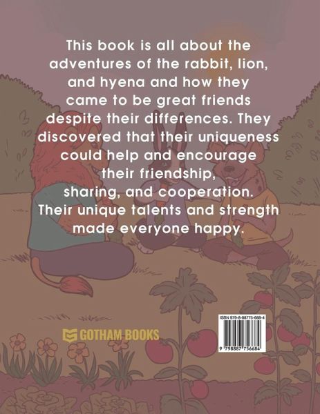 This book is all about the adventures of the rabbit, lion, and hyena and how they came to be great friends despite their differences. They discovered that their uniqueness could help and encourage their friendship, sharing, and cooperation. Their unique talents and strength made everyone happy.