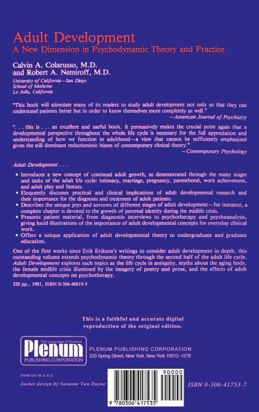 This is the second book in the pioneering investigation of adult develop ment by Robert A. Nemiroff and Calvin A. Colarusso. The first, Adult Development: A New Dimension in Psychodynamic Theory and Practice, ar rived to critical acclaim in 1981. It presented a psychodynamic theory of development during the second half of life and a model of normal adult functioning. This book is the logical sequel, expanding and elaborating the original formulations and applying them to the clinical practice of psychotherapy and psychoanalysis. Nemiroff and Colarusso demonstrate that these are appropriate techniques for patients in the second half of life, regardless of age. They lay to rest many stereotypes and myths that have long interfered with the dynamic treatment of older patients, and they propose exciting new conceptualizations such as that of adult develop mental arrests. The genetic approach reaches beyond childhood and adolescence and takes on important new meaning by incorporating an adult developmental past that influences both psychopathology and transference. The relationship between theory and therapy is richly demonstrated in the clinical presentations, including ten detailed case histories of pa tients between the ages of 40 and BO. These and other clinical discussions provide ample evidence that a psychodynamic approach that is based on a sound adult developmental psychology can be extraordinarily effective. They also demonstrate both the similarities and differences in working with older versus younger patients. This work is a major contribution in a long-neglected dimension of clinical psychiatry. SHERWYN M.