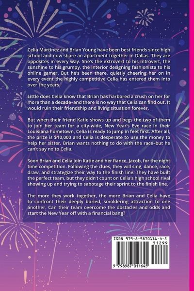 Celia Martinez and Brian Young have been best friends since high school and now share an apartment together in Dallas. They are opposites in every way. She's the extrovert to his introvert, the sunshine to his grumpy, the interior designing fashionista to his online gamer. But he's been there, quietly cheering her on in every event the highly competitive Celia has entered them into over the years. Little does Celia know that Brian has harbored a crush on her for more than a decade-and there is no way that Celia can find out. It would ruin their friendship and living situation forever. But when their friend Katie shows up and begs the two of them to join her team for a city-wide, New Year's Eve race in their Louisiana hometown, Celia is ready to jump in feet first. After all, the prize is $10,000 and Celia is desperate to use the money to help her sister. Brian wants nothing to do with the race-but he can't say no to Celia. Soon Brian and Celia join Katie and her fiance, Jacob, for the night time competition. Following the clues, they will sing, dance, race, draw, and strategize their way to the finish line. They have built the perfect team, but they didn't count on Celia's high school rival showing up and trying to sabotage their sprint to the finish line. The more they work together, the more Brian and Celia have to confront their deeply buried, smoldering attraction to one another. Can their team overcome the obstacles and odds and start the New Year off with a financial bang?