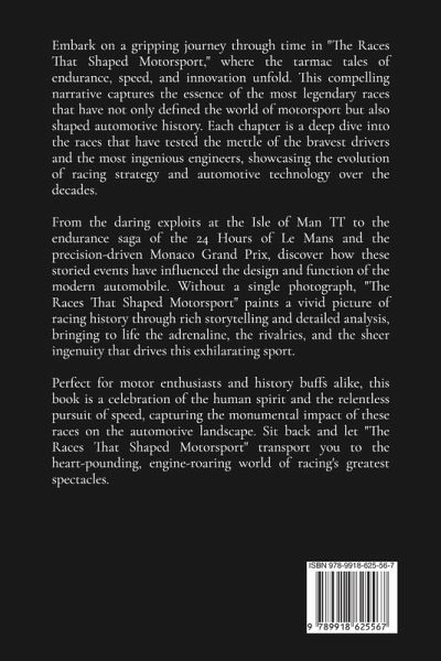 Embark on a gripping journey through time in "The Races That Shaped Motorsport," where the tarmac tales of endurance, speed, and innovation unfold. This compelling narrative captures the essence of the most legendary races that have not only defined the world of motorsport but also shaped automotive history. Each chapter is a deep dive into the races that have tested the mettle of the bravest drivers and the most ingenious engineers, showcasing the evolution of racing strategy and automotive technology over the decades. From the daring exploits at the Isle of Man TT to the endurance saga of the 24 Hours of Le Mans and the precision-driven Monaco Grand Prix, discover how these storied events have influenced the design and function of the modern automobile. Without a single photograph, "The Races That Shaped Motorsport" paints a vivid picture of racing history through rich storytelling and detailed analysis, bringing to life the adrenaline, the rivalries, and the sheer ingenuity that drives this exhilarating sport. Perfect for motor enthusiasts and history buffs alike, this book is a celebration of the human spirit and the relentless pursuit of speed, capturing the monumental impact of these races on the automotive landscape. Sit back and let "The Races That Shaped Motorsport" transport you to the heart-pounding, engine-roaring world of racing's greatest spectacles.
