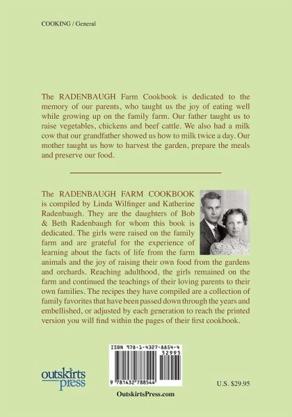 THE RADENBAUGH FARM COOKBOOK compiled by Linda Wilfinger and Katherine Radenbaugh Generation tested recipes straight from the farm to you! Are you looking for a cookbook that offers simple and quick to make meals with that just off the farm taste? This cookbook offers it all! Simple to make meals and desserts with ingredients that most of us already have on hand. No special utensils, or ingredients or techniques required to produce the taste of simple down home goodness. The authors invite you to enjoy the photos of farm family life from an earlier time as you try recipes passed down from generations of farm family cooks. Each cook added something to perfect the taste of these farm family favorites. From stick-to-the-ribs scalloped potatoes, soups for cold winter days, or company pleasing cheesecakes, there is sure to be a taste treat you and your family will enjoy. The book even includes a special section just for the younger members of the family with instructions on how to make play clay, decorative breadbaskets and giant bubbles. Keep the family dog happy with your baking skills and serve Fido a batch of our easy to make dog biscuits! All of the above can be found in the cookbook titled THE RADENBAUGH FARM COOKBOOK compiled by Linda Wilfinger and Katherine Radenbaugh and published by Outskirts Press.