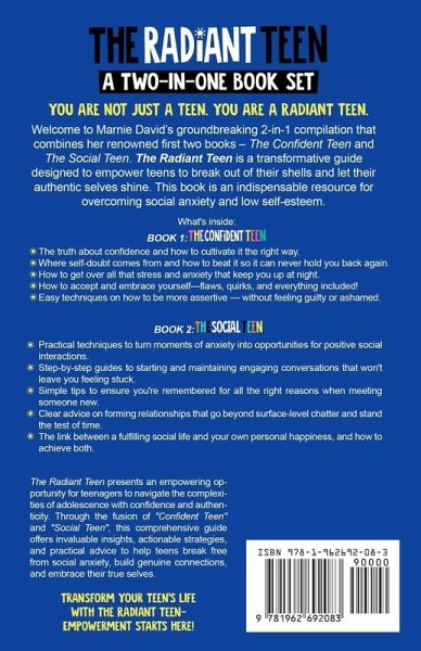 Written by a teacher with nearly 2 decades of teaching experience, The Radiant Teen presents an empowering opportunity for teenagers to navigate the complexities of adolescence with confidence and authenticity. Through the fusion of Confident Teen and Social Teen, this comprehensive guide offers invaluable insights, actionable strategies, and practical advice to help teens break free from social anxiety, build genuine connections, and embrace their true selves. Features of Confident Teen:Fundamentals of confidence, self-doubt, and overcoming fear. Effective strategies to address and overcome self-doubt. Learn how to nurture self-awareness and foster a positive self-image. Master positive self-talk and combat negative thought patterns. Navigate social pressures and stand out authentically amidst peers. Features of Social Teen:Recognize personal strengths and weaknesses as the cornerstone of social mastery. Identify common obstacles and fears hindering social interactions. Learn practical strategies to overcome social barriers. Acquire skills for initiating and maintaining engaging conversations confidently. Form genuine and lasting friendships based on mutual trust and respect. Pursue fulfilling lives aligned with personal values and aspirations. Apply strategies for social success in various settings, including family and professional environments. ...and countless other advantages! The Radiant Teen serves as a beacon of guidance for teenagers seeking to break free from social anxiety and forge genuine connections. Grab your copy and thrive in today's complex social landscape.