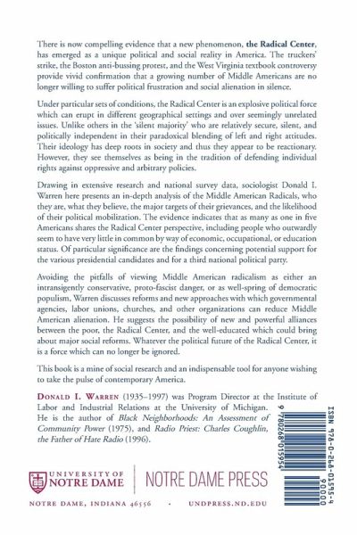 Drawing on extensive research and national survey data, sociologist Donald I. Warren here presents an in-depth analysis of the Middle American Radicals, who they are, what they believe, the major targets of their grievances, and the likelihood of their political mobilization. The evidence indicates that as many as one in five Americans shares the Radical Center perspective, including people who outwardly seem to have very little in common by way of economic, occupational, or education status. Of particular significance are the findings concerning potential support for the various presidential candidates and for a third national political party.