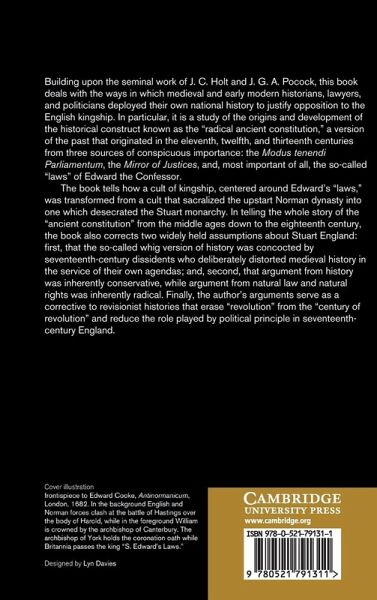 This book deals with the ways in which medieval and early modern historians, lawyers and politicians deployed their own national history to justify opposition to the English kingship. More particularly, it is a study of the origins and development of an historical construct called the 'radical ancient constitution', a version of the past which originated from sources including the so-called 'Laws' of Edward the Confessor. The book tells how a cult of kingship, centred around the Confessor's 'Laws', was transformed from a cult that sacralized the upstart Norman dynasty into one which desecrated the Stuart monarchy. In telling the story of the 'ancient constitution' the author reconfigures the historical landscape of early modern England and demonstrates that the so-called Whig version of history, far from being a concoction of seventeenth-century dissidents, enjoyed the sanction of medieval and early modern historians, scholars and lawyers.