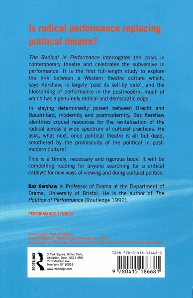 The Radical in Performance interrogates the crisis in contemporary theatre, and celebrates the subversive in performance. It is the first full-length study to explore the link between a western theatre culture which, says Kershaw, is largely 'past its sell-by-date' and the blossoming of postmodern performance, much of which has a genuinely radical edge. In staying determinedly poised between Brecht and Baudrillard, modernity and postmodernism, Baz Kershaw identifies crucial resources for the revitalisation of the radical across a wide spectrum of cultural practices. He asks, what next, once political theatre is all but dead, smothered by the promiscuity of the political in postmodern culture? This is a timely, necessary and rigorous book. It will be a compelling read for anyone searching for a critical catalyst for new ways of viewing and doing cultural politics.