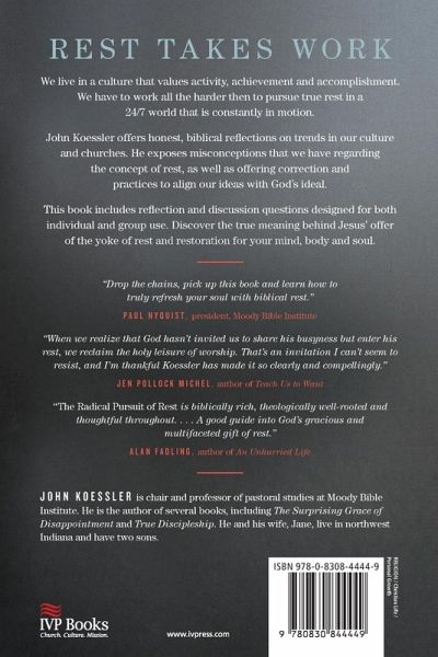 Whether in our careers, churches, schools or families, busyness is the norm, and anything less makes us feel unproductive and anxious. John Koessler understands that rest is not automatic or easy to attain. With honest, biblical reflections on trends in our culture and churches, he presents a unique perspective on how pursuing rest leads us to the heart of God.