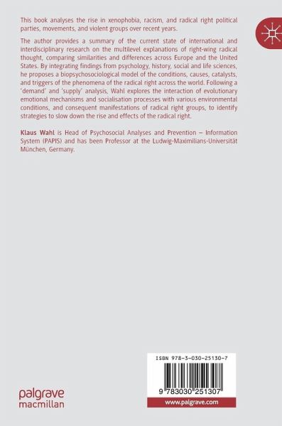 The author provides a summary of the current state of international and interdisciplinary research on the multilevel explanations of right-wing radical thought, comparing similarities and differences across Europe and the United States. By integrating findings from psychology, history, social and life sciences, he proposes a biopsychosociological model of the conditions, causes, catalysts, and triggers of phenomena of the radical right across the world. Following a 'demand' and 'supply' analysis, Wahl explores the interaction of evolutionary emotional mechanisms and socialization processes with various environmental conditions, and consequent manifestations of radical right groups, to identify strategies to slow down the rise and effects of the radical right.