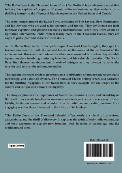 "The Radio Boys in the Thousand Islands" by J. W. Duffield is an adventure novel that follows the exploits of a group of young radio enthusiasts as they embark on a thrilling journey to the Thousand Islands region in the United States and Canada. The story centers around the Radio Boys, consisting of Bob Layton, Herb Fennington, and Joe Atwood, who are avid radio operators and friends. They are known for their technical expertise and passion for radio communication. When they learn about an upcoming international radio contest taking place in the Thousand Islands, they are eager to participate and showcase their skills. As the Radio Boys arrive in the picturesque Thousand Islands region, they quickly become immersed in both the natural beauty of the area and the excitement of the radio contest. However, their adventure takes an unexpected turn when they stumble upon a mystery involving a missing inventor and his valuable invention. The Radio Boys find themselves drawn into a web of intrigue as they attempt to solve the mystery and recover the missing invention. Throughout the novel, readers are treated to a combination of outdoor adventure, radio technology, and a dash of mystery. The Thousand Islands setting serves as a backdrop for the thrilling escapades of the Radio Boys as they navigate the challenges of the contest and the quest to unravel the mystery. The story emphasizes the importance of teamwork, resourcefulness, and friendship as the Radio Boys work together to overcome obstacles and solve the mystery. It also highlights the excitement and wonder of early radio communication, making it an engaging read for those interested in the history of technology. "The Radio Boys in the Thousand Islands" offers readers a blend of adventure, camaraderie, and the thrill of discovery. It captures the spirit of early radio enthusiasts and their eagerness to explore new frontiers, both in terms of technology and the world around them.