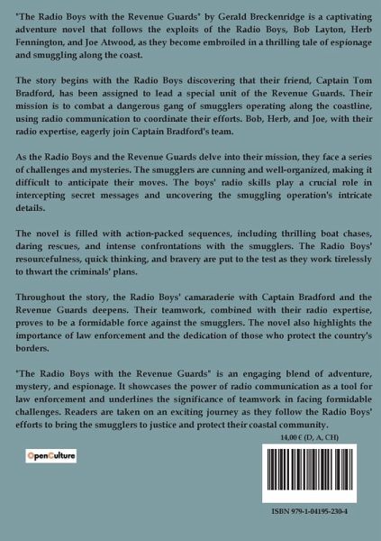 "The Radio Boys with the Revenue Guards" by Gerald Breckenridge is a captivating adventure novel that follows the exploits of the Radio Boys, Bob Layton, Herb Fennington, and Joe Atwood, as they become embroiled in a thrilling tale of espionage and smuggling along the coast. The story begins with the Radio Boys discovering that their friend, Captain Tom Bradford, has been assigned to lead a special unit of the Revenue Guards. Their mission is to combat a dangerous gang of smugglers operating along the coastline, using radio communication to coordinate their efforts. Bob, Herb, and Joe, with their radio expertise, eagerly join Captain Bradford's team. As the Radio Boys and the Revenue Guards delve into their mission, they face a series of challenges and mysteries. The smugglers are cunning and well-organized, making it difficult to anticipate their moves. The boys' radio skills play a crucial role in intercepting secret messages and uncovering the smuggling operation's intricate details. The novel is filled with action-packed sequences, including thrilling boat chases, daring rescues, and intense confrontations with the smugglers. The Radio Boys' resourcefulness, quick thinking, and bravery are put to the test as they work tirelessly to thwart the criminals' plans. Throughout the story, the Radio Boys' camaraderie with Captain Bradford and the Revenue Guards deepens. Their teamwork, combined with their radio expertise, proves to be a formidable force against the smugglers. The novel also highlights the importance of law enforcement and the dedication of those who protect the country's borders. "The Radio Boys with the Revenue Guards" is an engaging blend of adventure, mystery, and espionage. It showcases the power of radio communication as a tool for law enforcement and underlines the significance of teamwork in facing formidable challenges. Readers are taken on an exciting journey as they follow the Radio Boys' efforts to bring the smugglers to justice and protect their coastal community.