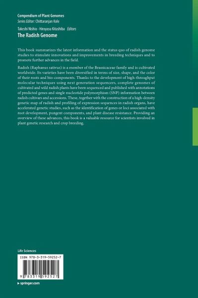Radish (Raphanus sativus) is a member of the Brassicaceae family and is cultivated worldwide. Its varieties have been diversified in terms of size, shape, and the color of their roots and bio-components. Thanks to the development of high-throughput molecular techniques using next generation sequencers, complete genomes of cultivated and wild radish plants have been sequenced and published with annotations of predicted genes and single nucleotide polymorphism (SNP) information between radish cultivars and accessions. These, together with the construction of a high-density genetic map of radish and profiling of expression sequences in radish organs, have accelerated genetic studies, such as the identification of genes or loci associated with root development, pungent components, andplant disease resistance. Providing an overview of these advances, this book is a valuable resource for scientists involved in plant genetic research and crop breeding.