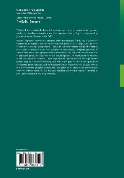 Radish (Raphanus sativus) is a member of the Brassicaceae family and is cultivated worldwide. Its varieties have been diversified in terms of size, shape, and the color of their roots and bio-components. Thanks to the development of high-throughput molecular techniques using next generation sequencers, complete genomes of cultivated and wild radish plants have been sequenced and published with annotations of predicted genes and single nucleotide polymorphism (SNP) information between radish cultivars and accessions. These, together with the construction of a high-density genetic map of radish and profiling of expression sequences in radish organs, have accelerated genetic studies, such as the identification of genes or loci associated with root development, pungent components, andplant disease resistance. Providing an overview of these advances, this book is a valuable resource for scientists involved in plant genetic research and crop breeding.