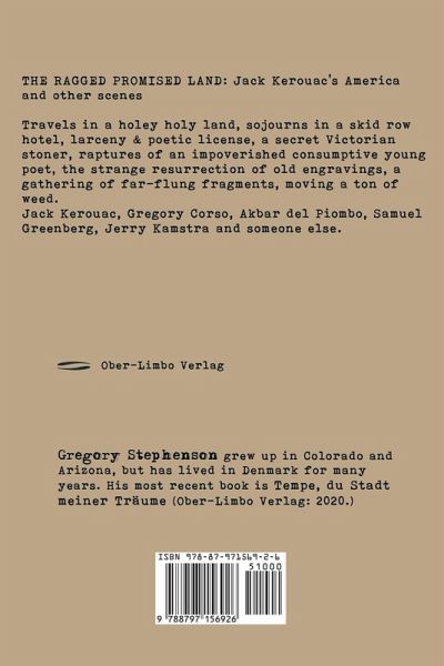 THE RAGGED PROMISED LAND: Jack Kerouac's America and other scenes. Travels in a holey holy land, sojourns in a skid row hotel, larceny & poetic license, a secret Victorian stoner, raptures of an impoverished consumptive young poet, the strange resurrection of old engravings, a gathering of far-flung fragments, moving a ton of weed. Jack Kerouac, Gregory Corso, Akbar del Piombo, Samuel Greenberg, Jerry Kamstra and someone else.