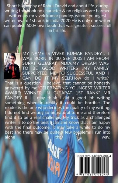 Short biography of Rahul Dravid and about life ,during writing this book no character & no religious are harmed written by mr vivek kumar pandey. winner youngest writer award 1st rank in india 2020.He is only one writer can publish 600+ own book that was greatest successfull in his life.