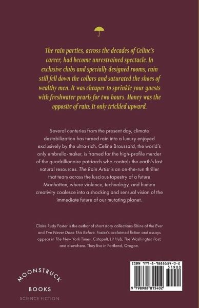 In a future where rain is a luxury enjoyed exclusively by the ultra-rich, the world's only umbrella-maker is framed for the high-profile murder of the quadrillionaire patriarch who controls the earth's last natural resources. Beautiful and horrific, The Rain Artist is pitched as Succession meets The Fifth Element and asks the question of how art and artists can thrive under commercialized capitalism. The Rain Artist started as a short story published in O: The Oprah Magazine and was included as a notable story in the Best American Science Fiction and Fantasy 2022 anthology by editors Rebecca Roanhorse and John Joseph Adams. The novel is the first in a series set in the immediate future of our mutating planet. About the author: Claire Rudy Foster's debut short story collection, Shine of the Ever, was named as one of the best LGBTQ books of the year by O: The Oprah Magazine and was a finalist for the Foreword INDIE Awards. The book was selected for the ALA 2021 Over the Rainbow Fiction and Poetry Longlist. Foster's essays and fiction have appeared in many places, including The New York Times, Black Static, Lit Hub, The Guardian, Mic, McSweeney's, and Catapult. Their writing has been recognized with four Pushcart Prize nominations. Foster is the co-writer of the bestselling nonfiction book Unsettled: How the Purdue Pharma Bankruptcy Failed the Victims of the American Overdose Crisis, which was named the "best bankruptcy book in the world" and one of Ralph Nader's top picks of the year. "The Rain Artist is an evocative feast of all-too relevant eco and dystopian horror backdropped by smart, compelling storytelling that echoes the literary odyssey's of Ursula K. Le Guin's The Word for World is Forest and Margaret Atwood's Oryx and Crake. Remarkable characters, disturbing, and perpetually beautiful. Celine Broussard is about to become everybody's new favorite heroine. C. R. Foster's brilliant, award-winning writing shines brightest in this apocalyptic, page-turning novel." -Kayli Scholz, author of Saint Grit "A deluge of talent & surrealism engulfs the senses in The Rain Artist. Part Le Guin, part Mary Shelley, it is a moving picture guiding you through its lavish rooms." -Ingrid M. Calderon-Collins, poet and publisher, Resurrection Press "Smart, haunting, and exceptional ... The characters in Claire Rudy Foster's fiction are all achingly lonely and the victims of human error, yes-but they're also miracles of endurance whose devastations, large and small, illuminate the better parts of ourselves." -Benjamin Percy, author of The Dark Net, The Dead Lands, Red Moon, and The Wilding "... an otherworldly, Atwood-esque dystopia." -Michelle Hart, Books Editor, O: The Oprah Magazine