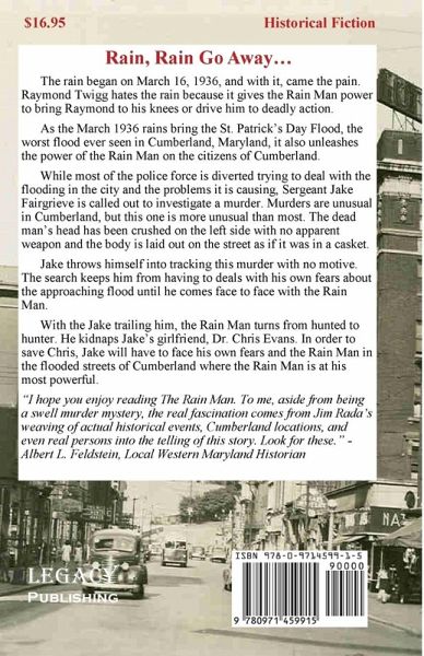 The rain began on March 16, 1936, and with it, the rain came pain. Raymond Twigg hates the rain because it gives the Rain Man power. It is a power to bring Raymond to his knees or drive him to deadly action. As the March 1936 rains bring the St. Patrick’s Day Flood, the worst flood ever seen in Cumberland, Maryland, it also unleashes the power of the Rain Man on the citizens of the city. While most of the police force is diverted trying to deal with the flooding in the city and the problems it is causing, Sergeant Jake Fairgrieve is called out to investigate a murder. Murders are unusual in Cumberland, but this one is more unusual than most. The dead man’s head has been crushed on the left side with no apparent weapon and the body is laid out on the street as if it was in a casket. Jake throws himself into tracking this murder with no motive. The search keeps him from having to deal with his own fears about the approaching flood until he comes face to face with the Rain Man. With the Jake trailing him, the Rain Man turns from hunted to hunter. He kidnaps Jake’s girlfriend, Dr. Chris Evans. In order to save Chris, Jake will have to face his own fears and the Rain Man in the flooded streets of Cumberland where the Rain Man is at his most powerful.
