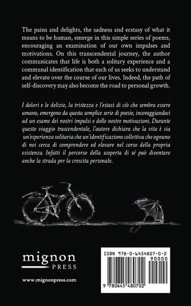 Bilingual book in English and Italian The strength and linguistic vibrancy of this work is achieved through its emotional incisiveness and by moulding fresh image from the texture of our universally-shared human experiences. Through simplified character portraits, the poet presents life as an emotional image palette, exemplifying our human traits and idiosyncrasies. Positive social, ethical and environmental values are gently embedded as the author shows us variations of the world through differing perceptual eyes: those building up our inner pictures, and those prodding the outer world of our actions. There is a contemporary relevance in the themes explored, including an emphasis on self-worth and creative potential, as well as our interconnectedness with nature and our social interactions with others. A declarative and authorial voice is interspersed with distilled moments, softer musings and sensitivity, prompting an awareness of our human emotions and the role they play in our personal development and also as a product of our internal schemes of self-preservation. By evoking a mystical exploration of human feelings and ideas, the reader is invited to reflect upon and to engage in the deeper signification of each poem, and to periodically redefine its relevance on an individual and general/universal level. Edizione bilingue in inglese e italiano La forza e la vivacità linguistica di questo lavoro sono ottenute attraverso la sua incisività emotiva e che plasmano immagini fresche dal tessuto delle nostre esperienze umane universalmente condivise. Attraverso ritratti di personaggi semplificati, il poeta presenta la vita come una tavolozza di immagini emozionali, che esemplificano i nostri tratti umani e le nostre idiosincrasie. I valori sociali, etici ed ambientali positivi sono delicatamente incorporati mentre l'autore ci mostra variazioni del mondo attraverso diversi occhi percettivi: quelli che costruiscono le nostre immagini interiori e quelli che stimolanto il mondo esterno delle nostre azioni. I temi esplorati sono di grande attualità e pongono l'accento sull'autostima e sul potenziale creativo, sull'interconnessione con la natura e sulle interazioni sociali con gli altri. Una voce dichiarativa e autoriale è intervallata da momenti distillati, riflessioni più morbide e sensitività, sollecitando una presa di coscienza delle nostre emozioni umane e del ruolo che esse svolgono nel nostro sviluppo personale e come prodotto dei nostri schemi interni di autoconservazione. Tramite un'esplorazione mistica dei sentimenti e delle idee umane, il lettore è invitato a riflettere e a impegnarsi nel significato più profondo di ogni poesia e a ridefinirne periodicamente la rilevanza a livello individuale e generale/universale.