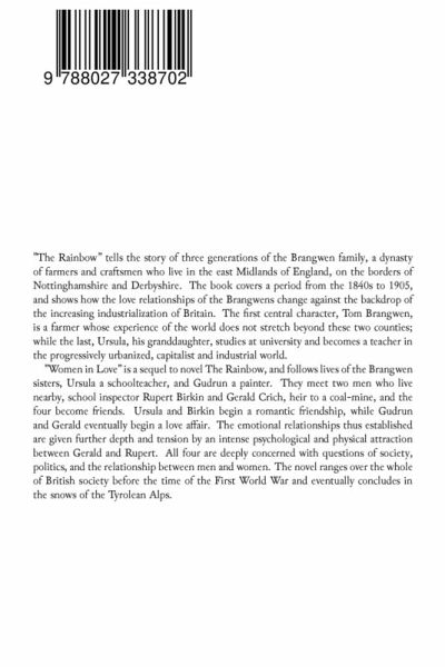 "The Rainbow" tells the story of three generations of the Brangwen family, a dynasty of farmers and craftsmen who live in the east Midlands of England, on the borders of Nottinghamshire and Derbyshire. The book covers a period from the 1840s to 1905, and shows how the love relationships of the Brangwens change against the backdrop of the increasing industrialization of Britain. The first central character, Tom Brangwen, is a farmer whose experience of the world does not stretch beyond these two counties; while the last, Ursula, his granddaughter, studies at university and becomes a teacher in the progressively urbanized, capitalist and industrial world. "Women in Love" is a sequel to novel The Rainbow, and follows lives of the Brangwen sisters, Ursula a schoolteacher, and Gudrun a painter. They meet two men who live nearby, school inspector Rupert Birkin and Gerald Crich, heir to a coal-mine, and the four become friends. Ursula and Birkin begin a romantic friendship, while Gudrun and Gerald eventually begin a love affair. The emotional relationships thus established are given further depth and tension by an intense psychological and physical attraction between Gerald and Rupert. All four are deeply concerned with questions of society, politics, and the relationship between men and women. The novel ranges over the whole of British society before the time of the First World War and eventually concludes in the snows of the Tyrolean Alps.