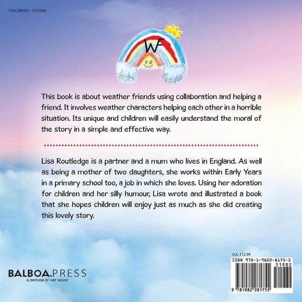 I would like this to be placed on the back cover please. This book is about weather friends using collaboration and helping a friend. It involves weather characters helping each other in a horrible situation. Its unique and children will easily understand the moral of the story in a simple and effective way.
