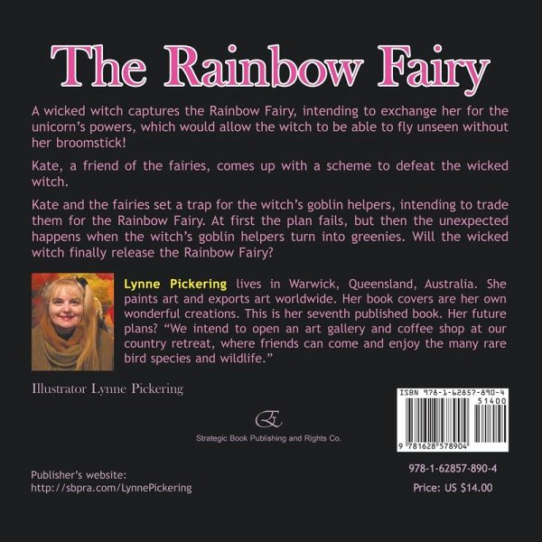 A wicked witch captures the Rainbow Fairy, intending to exchange her for the unicorn's powers, which would allow the witch to be able to fly unseen without her broomstick!Kate, a friend of the fairies, comes up with a scheme to defeat the wicked witch.Kate and the fairies set a trap for the witch's goblin helpers, intending to trade them for the Rainbow Fairy. At first the plan fails, but then the unexpected happens when the witch's goblin helpers turn into greenies. Will the wicked witch finally release the Rainbow Fairy? Lynne Pickering lives in Warwick, Queensland, Australia. She paints art and exports art worldwide. Her book covers are her own wonderful creations. This is her seventh published book. Her future plans? "We intend to open an art gallery and coffee shop at our country retreat, where friends can come and enjoy the many rare bird species and wildlife."