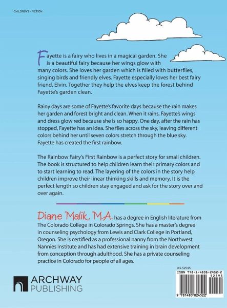 Fayette is a fairy who lives in a magical garden. She is a beautiful fairy because her wings glow with many colors. She loves her garden which is filled with butterflies, singing birds and friendly elves. Fayette especially loves her best fairy friend, Elvin. Together they help the elves keep the forest behind Fayette's garden clean. Rainy days are some of Fayette's favorite days because the rain makes her garden and forest bright and clean. When it rains, Fayette's wings and dress glow red because she is so happy. One day, after the rain has stopped, Fayette has an idea. She flies across the sky, leaving different colors behind her until seven colors stretch through the blue sky. Fayette has created the first rainbow. The Rainbow Fairy's First Rainbow is a perfect story for small children. The book is structured to help children learn their primary colors and to start learning to read. The layering of the colors in the story help children improve their linear thinking skills and memory. It is the perfect length so children stay engaged and ask for the story over and over again.