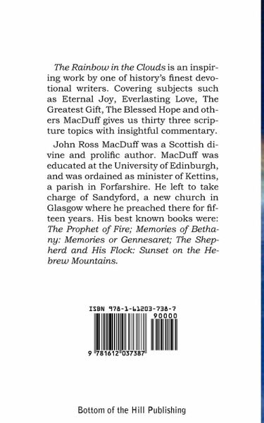 The Rainbow in the Clouds is an inspiring work by one of history's finest devotional writers. Covering subjects such as Eternal Joy, Everlasting Love, The Greatest Gift, The Blessed Hope and others MacDuff gives us thirty three scripture topics with insightful commentary. John Ross MacDuff was a Scottish divine and prolific author. MacDuff was educated at the University of Edinburgh, and was ordained as minister of Kettins, a parish in Forfarshire. He left to take charge of Sandyford, a new church in Glasgow where he preached there for fifteen years. His best known books were: The Prophet of Fire; Memories of Bethany: Memories or Gennesaret; The Shepherd and His Flock: Sunset on the Hebrew Mountains.