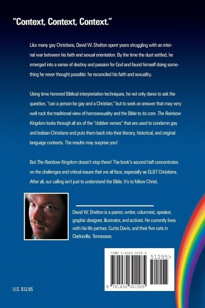 "Can a person be gay and a Christian?" This is a question that countless thousands of people have asked themselves in the course of their lives. Whether they are struggling with this issue themselves or if they know loved ones who are wrestling with their sexual orientation, there's now hope! The Rainbow Kingdom: Christianity & the Homosexual Reconciled, a new book by David W. Shelton, answers that question and many others that we deal with as GLBT and GLBT-affirming Christians. In the first half, The Rainbow Kingdom addresses the "clobber" verses that are used to condemn gay and lesbian people throughout the world. Then, the message shifts from instruction to ministry, meeting many of today's issues head-on.