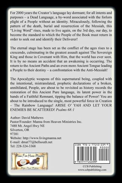 For 2000 years the Creator's language lay dormant; for all intents and purposes - a Dead Language, a by-word associated with the forlorn plight of a People without an identity. Miraculously, following the pattern of the death, burial and resurrection of the Messiah, this "Living Word" rises, made to live again, on the 3rd day, our day, to become the standard to which the People of the Book must return in order to seek out and identify their Deliverer! The eternal stage has been set as the conflict of the ages rises to a crescendo, culminating in the greatest assault against The Sovereign King and those in Covenant with Him, that the world has ever seen. It is by no means an accident that an awakening is occurring. The return to the Ancient Paths and an even more Ancient Tongue leading a People to their destiny - a confrontation with the Anti-Messiah! The Apocalyptic weapons of this supernatural being, coupled with the intentional, mistranslated, prophetic declarations of a broken, annihilated, People, are about to be revisited as history records the restoration of this Ancient Pure language, its latent power in the hands of a Faithful Remnant, tipping the balance of Power! You are about to be introduced to the single, most powerful force in Creation - The Rainbow Language! ARISE O' YAH AND LET YOUR ENEMIES BE SCATTERED! Psalms 68:1 About the Author: David Mathews is the Pastor/Founder of Manna from Heaven Ministries located in Salem, Oregon where he and his wife Brenda oversee a local congregation. The ministry has an international radio and television presence with over 30 years of trusted, proven ministry service (the last decade and a half leading a Sabbath keeping, Torah observant, and Hebrew Roots assembly). His message incorporates the depths of the Hebrew language and the subtle nuances of the pictographic lettering and their numeric values into the tapestry of his teaching. His extensive background in marriage and family counseling and uncompromising commitment toward a return to the Pure Language of Scripture is the driving force behind the vision of restoring the traditional marriage covenant and family structure according to Torah.