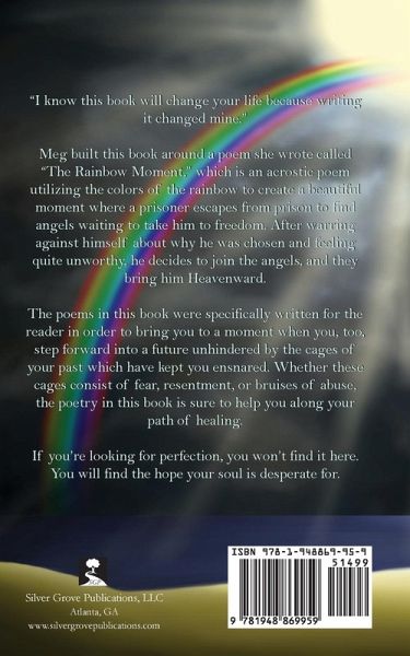 "I know this book will change your life because writing it changed mine." Meg built this book around a poem she wrote called "The Rainbow Moment", which is an acrostic poem utilizing the colors of the rainbow to create a beautiful moment where a prisoner escapes from prison to find angels waiting to take him to freedom. After warring against himself about why he was chosen and feeling quite unworthy, he decides to join the angels, and they bring him Heavenward. The poems in this book were specifically written for the reader in order to bring you to a moment when you, too, step forward into a future unhindered by the cages of your past which have kept you ensnared. Whether these cages consist of fear, resentment, or bruises of abuse, the poetry in this book is sure to help you along your path of healing. If you're looking for perfection, you won't find it here. You will find the hope your soul is desperate for.
