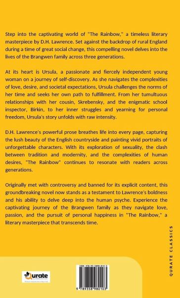 Step into the captivating world of "The Rainbow," a timeless literary masterpiece by D.H. Lawrence. Set against the backdrop of rural England during a time of great social change, this compelling novel delves into the lives of the Brangwen family across three generations. At its heart is Ursula, a passionate and fiercely independent young woman on a journey of self-discovery. As she navigates the complexities of love, desire, and societal expectations, Ursula challenges the norms of her time and seeks her own path to fulfillment. From her tumultuous relationships with her cousin, Skrebensky, and the enigmatic school inspector, Birkin, to her inner struggles and yearning for personal freedom, Ursula's story unfolds with raw intensity. D.H. Lawrence's powerful prose breathes life into every page, capturing the lush beauty of the English countryside and painting vivid portraits of unforgettable characters. With its exploration of sexuality, the clash between tradition and modernity, and the complexities of human desires, "The Rainbow" continues to resonate with readers across generations. Originally met with controversy and banned for its explicit content, this groundbreaking novel now stands as a testament to Lawrence's boldness and his ability to delve deep into the human psyche. Experience the captivating journey of the Brangwen family as they navigate love, passion, and the pursuit of personal happiness in "The Rainbow," a literary masterpiece that transcends time.