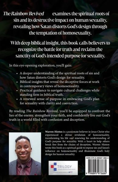 The Rainbow Revived examines the spiritual roots of sin and its destructive impact on human sexuality, revealing how Satan distorts God's design through the temptation of homosexuality. With deep biblical insight, this book calls believers to recognized the battle for truth and reclaim the sanctity of God's intended purpose for sexuality. In this eye-opening exploration, you'll gain: -A deeper understanding of the spiritual roots of sin and how Satan distorts God's design for sexuality. -Biblical insights that reveal the deceptive forces at work in contemporary views of homosexuality. -Practical guidance to navigate cultural challenges while standing firm in biblical truth. -A renewed sense of purpose in embracing God's plan for sexuality with clarity and conviction. By reading The Rainbow Revived, you'll be equipped to confront the lies of the enemy, strengthen your faith, and confidently live out God's truth in a world filled with confusion and deception.