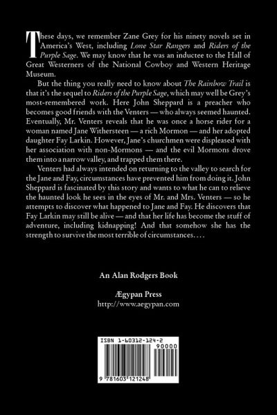 These days, we remember Zane Grey for his ninety novels set in America's West, including Lone Star Rangers and Riders of the Purple Sage. We may know that he was an inductee to the Hall of Great Westerners of the National Cowboy and Western Heritage Museum. But the thing you really need to know about The Rainbow Trail is that it's the sequel to Riders of the Purple Sage, which may well be Grey's most-remembered work. Here John Sheppard is a preacher who becomes good friends with the Venters -- who always seemed haunted. Eventually, Mr. Venters reveals that he was once a horse rider for a woman named Jane Withersteen -- a rich Mormon -- and her adopted daughter Fay Larkin. However, Jane's churchmen were displeased with her association with non-Mormons -- and the evil Mormons drove them into a narrow valley and trapped them there. Venters had always intended on returning to the valley to search for the Jane and Fay, circumstances have prevented him from doing it. John Sheppard is fascinated by this story and wants to what he can to relieve the haunted look he sees in the eyes of Mr. and Mrs. Venters -- so he attempts to discover what happened to Jane and Fay. He discovers that Fay Larkin may still be alive -- and that her life has become the stuff of adventure, including kidnapping! And that somehow she has the strength to survive the most terrible of circumstances. . . .