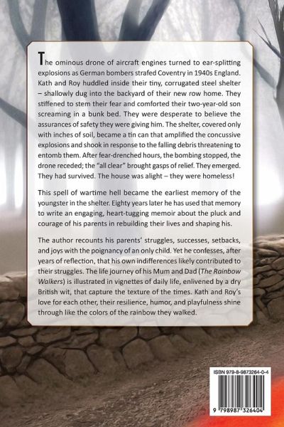 The ominous drone of aircraft engines turned to ear-splitting explosions as German bombers strafed Coventry in 1940s England. Kath and Roy huddled inside their tiny, corrugated steel shelter - shallowly dug into the backyard of their new row home. They stiffened to stem their fear and comforted their two-year-old son screaming in a bunk bed. They were desperate to believe the assurances of safety they were giving him. The shelter, covered only with inches of soil, became a tin can that amplified the concussive explosions and shook in response to the falling debris threatening to entomb them. After fear-drenched hours, the bombing stopped, the drone receded; the "all clear" brought gasps of relief. They emerged. They had survived. The house was alight - they were homeless! This spell of wartime hell became the earliest memory of the youngster in the shelter. Eighty years later he has used that memory to write an engaging, heart-tugging memoir about the pluck and courage of his parents in rebuilding their lives and shaping his. The author recounts his parents' struggles, successes, setbacks, and joys with the poignancy of an only child. Yet he confesses, after years of reflection, that his own indifferences likely contributed to their struggles. The life journey of his Mum and Dad (The Rainbow Walkers) is illustrated in vignettes of daily life, enlivened by a dry British wit, that capture the texture of the times. Kath and Roy's love for each other, their resilience, humor, and playfulness shine through like the colors of the rainbow they walked.
