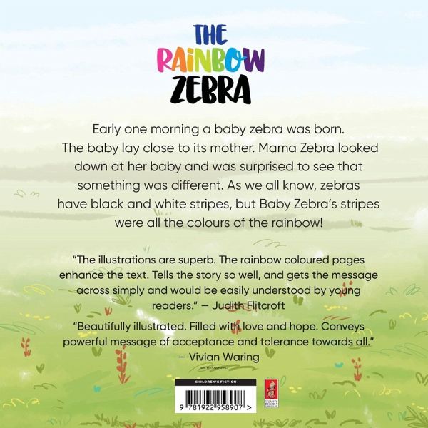 Early one morning a baby zebra was born. The baby lay close to its mother. Mama Zebra looked down at her baby and was surprised to see that something was different. As we all know, zebras have black and white stripes, but Baby Zebra's stripes were all the colours of the rainbow!