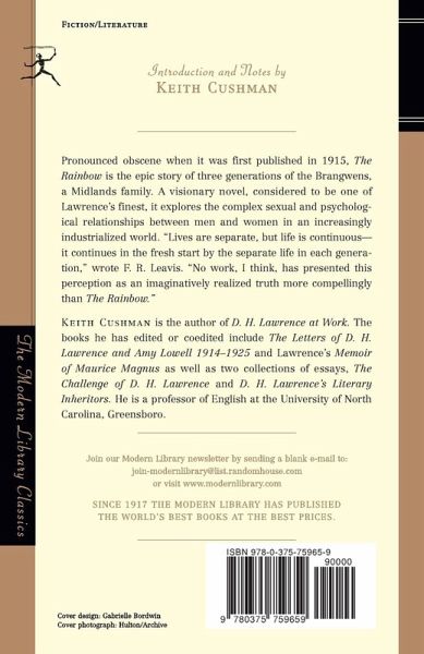 Selected by the Modern Library as one of the 100 best novels of all time Pronounced obscene when it was first published in 1915, The Rainbow is the epic story of three generations of the Brangwens, a Midlands family. A visionary novel, considered to be one of Lawrence's finest, it explores the complex sexual and psychological relationships between men and women in an increasingly industrialized world. "Lives are separate, but life is continuous-it continues in the fresh start by the separate life in each generation," wrote F. R. Leavis. "No work, I think, has presented this perception as an imaginatively realized truth more compellingly than The Rainbow."