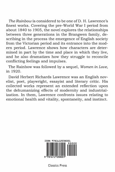 The Rainbow is considered to be one of D. H. Lawrence's finest works. Covering the pre-World War I period from about 1840 to 1905, the novel explores the relationships between three generations in the Brangwen family, describing in the process the emergence of English society from the Victorian period and its entrance into the modern period. Lawrence shows how characters are determined in part by the time and place in which they live, and he also dramatizes how they struggle to reconcile conflicting feelings and impulses. The Rainbow was followed by a sequel, Women in Love, in 1920. David Herbert Richards Lawrence was an English novelist, poet, playwright, essayist and literary critic. His collected works represent an extended reflection upon the dehumanizing effects of modernity and industrialization. In them, Lawrence confronts issues relating to emotional health and vitality, spontaneity, and instinct.