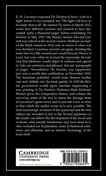 D. H. Lawrence expected The Rainbow to have 'a bit of a fight' before it was accepted, but 'The fight will have to be made, that is all'. It was suppressed, just over a month after publication, in November 1915. The American publisher would make thirteen further cuts and 'dribble out' the book quietly. In 1930 the British government would again consider suppressing a new printing of The Rainbow. Professor Mark Kinkead-Weekes gives the composition history and collates the surviving states of the text to assess the damage done to Lawrence's novel, and to provide a text as close to that which the author wrote as is now possible. The final manuscript, revisions in the typescript and the first edition are recorded in full in the textual apparatus so the reader can follow the novel's development and evaluate what outside interference may have done to it. Also included are explanatory notes to historical references and allusions, and an interior chronology of the book itself.