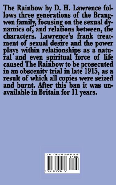 The Rainbow by D. H. Lawrence follows three generations of the Brangwen family, focusing on the sexual dynamics of, and relations between, the characters. Lawrence's frank treatment of sexual desire and the power plays within relationships as a natural and even spiritual force of life caused The Rainbow to be prosecuted in an obscenity trial in late 1915, as a result of which all copies were seized and burnt. After this ban it was unavailable in Britain for 11 years.