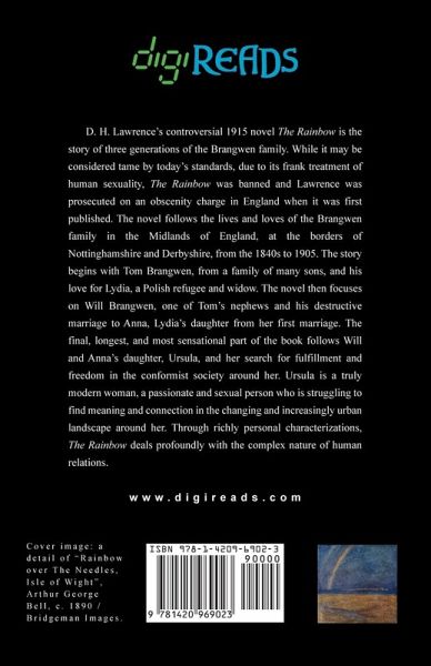 D. H. Lawrence’s controversial 1915 novel "The Rainbow" is the story of three generations of the Brangwen family. While it may be considered tame by today’s standards, due to its frank treatment of human sexuality, "The Rainbow" was banned and Lawrence was prosecuted on an obscenity charge in England when it was first published. The novel follows the lives and loves of the Brangwen family in the Midlands of England, at the borders of Nottinghamshire and Derbyshire, from the 1840s to 1905. The story begins with Tom Brangwen, from a family of many sons, and his love for Lydia, a Polish refugee and widow. The novel then focuses on Will Brangwen, one of Tom’s nephews and his destructive marriage to Anna, Lydia’s daughter from her first marriage. The final, longest, and most sensational part of the book follows Will and Anna’s daughter, Ursula, and her search for fulfillment and freedom in the conformist society around her. Ursula is a truly modern woman, a passionate and sexual person who is struggling to find meaning and connection in the changing and increasingly urban landscape around her. Through richly personal characterizations, "The Rainbow" deals profoundly with the complex nature of human relations. This edition is printed on premium acid-free paper.