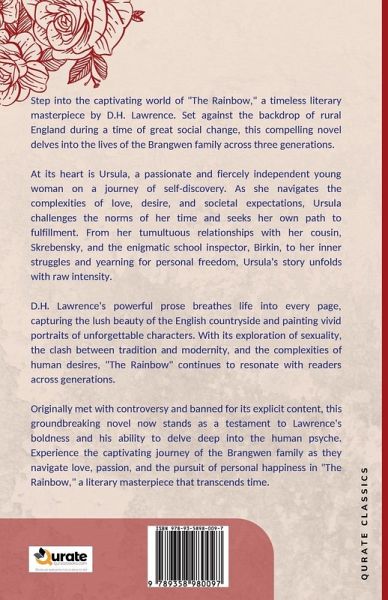 Step into the captivating world of "The Rainbow," a timeless literary masterpiece by D.H. Lawrence. Set against the backdrop of rural England during a time of great social change, this compelling novel delves into the lives of the Brangwen family across three generations. At its heart is Ursula, a passionate and fiercely independent young woman on a journey of self-discovery. As she navigates the complexities of love, desire, and societal expectations, Ursula challenges the norms of her time and seeks her own path to fulfillment. From her tumultuous relationships with her cousin, Skrebensky, and the enigmatic school inspector, Birkin, to her inner struggles and yearning for personal freedom, Ursula's story unfolds with raw intensity. D.H. Lawrence's powerful prose breathes life into every page, capturing the lush beauty of the English countryside and painting vivid portraits of unforgettable characters. With its exploration of sexuality, the clash between tradition and modernity, and the complexities of human desires, "The Rainbow" continues to resonate with readers across generations. Originally met with controversy and banned for its explicit content, this groundbreaking novel now stands as a testament to Lawrence's boldness and his ability to delve deep into the human psyche. Experience the captivating journey of the Brangwen family as they navigate love, passion, and the pursuit of personal happiness in "The Rainbow," a literary masterpiece that transcends time.