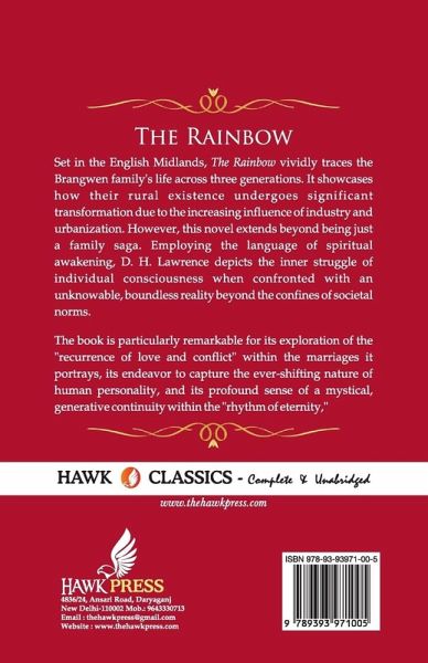 Set in the English Midlands, The Rainbow vividly traces the Brangwen family's life across three generations. It showcases how their rural existence undergoes significant transformation due to the increasing influence of industry and urbanization. However, this novel extends beyond being just a family saga. Employing the language of spiritual awakening, D. H. Lawrence depicts the inner struggle of individual consciousness when confronted with an unknowable, boundless reality beyond the confines of societal norms.The book is particularly remarkable for its exploration of the "recurrence of love and conflict" within the marriages it portrays, its endeavor to capture the ever-shifting nature of human personality, and its profound sense of a mystical, generative continuity within the "rhythm of eternity,"