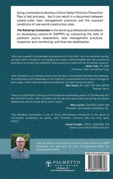 Connect the dots between soil science and construction practices to prevent storm water pollution. Discover best practices for keeping communities safe after storms and natural disasters from an expert storm water professional. In The Raindrop Connection, author John M. Teravskis considers erosion and the science of sediment as it relates to implementing safe and sustainable construction practices. For Teravskis, the key to compliance is making connections between theory and practice while balancing the consequences of one's actions with water supplies in need of protection. From start to finish, Teravskis assesses each step of a construction project, connecting the dots from erosion and sediment theory pollutant source assessment best management practices Storm Water Pollution Prevention Plan development effective monitoring programs final site stabilization to healthy water quality and retention. While the book is filled with technical content, the tone is intentionally conversational, sprinkled with subtle humor, personal anecdotes and real-life, practical illustrations that will appeal to non-technical as well as technical readers. Informative and innovative, the book also acts as a guide for construction workers, engineers, environmental consultants, or municipal staff members on how to comply with the Clean Water Act and any applicable state laws.
