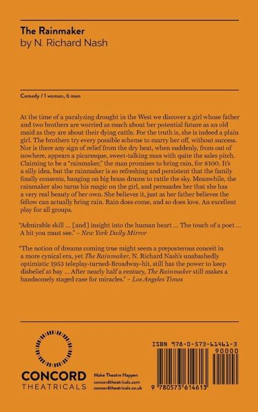 This lively play was a 1954 hit on Broadway and a 1956 film. It concerns an elderly Western rancher, his three children, and an itinerant con artist who boasts he can save their drought-parched herd by creating rain. The major focus is on the spinster daughter, Lizzie Curry, who naturally falls for the con artist. The relationship is aided by that fact that Lizzie's father and two brothers seem more worried about her marital prospects than about the drought that's killing their cattle.