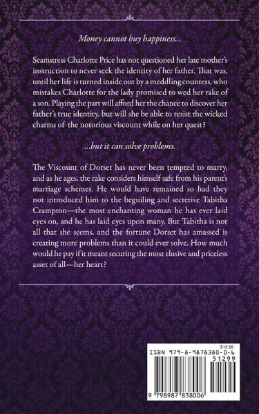Money cannot buy happiness... Seamstress Charlotte Price has not questioned her late mother's instruction to never seek the identity of her father. That was, until her life is turned inside out by a meddling countess, who mistakes Charlotte for the lady promised to wed her rake of a son. Playing the part will afford her the chance to discover her father's true identity, but will she be able to resist the wicked charms of the notorious viscount while on her quest? ...but it can solve problems. The Viscount of Dorset has never been tempted to marry, and as he ages, the rake considers himself safe from his parent's marriage schemes. He would have remained so had they not introduced him to the beguiling and secretive Tabitha Crampton-the most enchanting woman he has ever laid eyes on, and he has laid eyes upon many. But Tabitha is not all that she seems, and the fortune Dorset has amassed is creating more problems than it could ever solve. How much would he pay if it meant securing the most elusive and priceless asset of all-her heart?