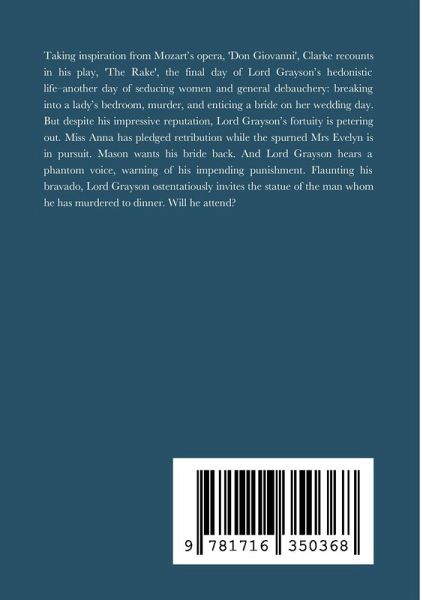 Taking inspiration from Mozart's opera, 'Don Giovanni', Clarke recounts in his play, 'The Rake', the final day of Lord Grayson's hedonistic life-another day of seducing women and general debauchery: breaking into a lady's bedroom, murder, and enticing a bride on her wedding day. But despite his impressive reputation, Lord Grayson's fortuity is petering out. Miss Anna has pledged retribution while the spurned Mrs Evelyn is in pursuit. Mason wants his bride back. And Lord Grayson hears a phantom voice, warning of his impending punishment. Flaunting his bravado, Lord Grayson ostentatiously invites the statue of the man whom he has murdered to dinner. Will he attend?