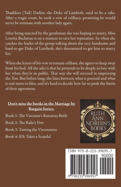 Thaddeus (Tad) Darkin, the Duke of Lambeth, used to be a rake. After a tragic event, he took a vow of celibacy, promising he would never be intimate with another lady again. Over the years, this caused him to be the most sought-after single gentleman in all of London. And even though he doesn't want to marry, his steward left him in financial ruin, so whether he likes it or not, he must take a wife. After being rejected by the gentleman she was hoping to marry, Miss Loretta Bachman is on a mission to save her reputation. She needs to marry someone who will impress the prestigious ladies in her social circle. So when she catches the leader of the group talking about the very handsome and hard-to-get Duke of Lambeth, she's determined to get him to marry her. All she needs is a little bargaining power, and fortunately for her, she happens to have the money he needs to save his estate. When she learns of his vow to remain celibate, she agrees to keep away from his bed. After all, her only reason for marrying him is to secure her social standing in London, not to have a love match. All she asks is that he pretends to be deeply in love with her when they're in public. That way she will succeed in impressing the Ton. But before long, the lines between what is pretend and what is real starts to blur, and it's hard to decide how far to push the limits of their agreement.