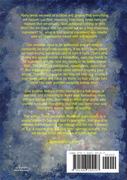 Many times we want to achieve and believe that everything will happen just fine. However, how many times have we realised that we actually have achieved nothing or very little? Did we notice that we missed out on a very important ingrediant? So, what is that special ingrediant you maybe asking? Organisation mixed with self account. Our mistakes need to be addressed and we need to constantly be improving ourselves, if we don't know where we went wrong, we simply cannot turn it right. That's why, during the special month of Ramadhan, each day needs to be examined and the next day needs to be better inshaa Allah. The priniciple mentioned, nonetheless, states that this improvement cannot come without knowing your wrong. Therefore, a journal like this will help you to attack your weak points and focus on them- so that you can turn them into your greatest weapons inshaa Allah.