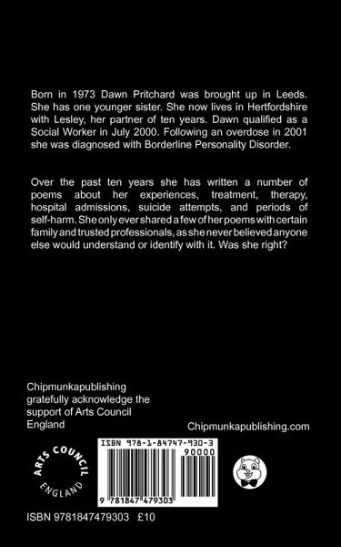 Born in 1973 Dawn Pritchard was brought up in Leeds. She has one younger sister. She now lives in Hertfordshire with Lesley, her partner of ten years. Dawn qualified as a Social Worker in July 2000. Following an overdose in 2001 she was diagnosed with Borderline Personality Disorder. Over the past ten years she has written a number of poems about her experiences, treatment, therapy, hospital admissions, suicide attempts, and periods of self-harm. She only ever shared a few of her poems with certain family and trusted professionals, as she never believed anyone else would understand or identify with it. Was she right?