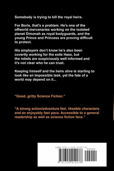 Someone is trying to kill the royal heirs. For Boris, that's a problem. He's an offworld mercenary working on the isolated planet Dimonah as a royal bodyguard, and the young Prince and Princess are proving to have powerful enemies. His employers don't know about his covert work with the exile Hass, but the rebels are suspiciously well informed and it's not clear who he can trust. Keeping himself and the heirs alive is starting to look impossible, yet the fate of a world may depend on it. "Good, Gritty Science Fiction." "A strong action/adventure feel, likeable characters, and a coherent political thriller plot... enjoyably fast-paced... extremely accessible to a general readership as well as science fiction fans."