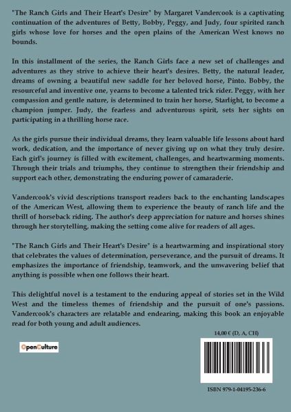 "The Ranch Girls and Their Heart's Desire" by Margaret Vandercook is a narrative that explores themes of identity, belonging, and the pull of one's roots. The story follows Jacqueline Ralston Kent, a widow who returns to her childhood home, the Rainbow Ranch in Wyoming, after the death of her English husband. Despite her title as Lady Kent, Jack feels a stronger connection to her American heritage and the freedom of the western lifestyle. Her return is marked by a desire to reclaim her American citizenship and to raise her son, Jimmie, in the environment she cherishes. The narrative delves into Jack's internal conflict between the societal expectations of her title and her personal longing for the simplicity and authenticity of ranch life. As Jack reacquaints herself with the ranch, she faces criticism from her family and neighbors for her unconventional behavior, such as participating in cowboy activities. Her sister Frieda and other family members express concern over Jack's choices, fearing they might tarnish her reputation. However, Jack's determination to live life on her own terms is unwavering. The story also introduces Peter Stevens, a former acquaintance and a rising political figure, who challenges Jack's decisions and represents the societal pressures she faces. Throughout the narrative, Jack's interactions with her family, including her son and her sister's children, highlight the generational differences and the evolving roles of women. The novel captures the essence of the American West and the enduring spirit of those who choose to live outside conventional norms. Jack's journey is one of self-discovery, as she navigates the complexities of identity, family expectations, and personal desires.